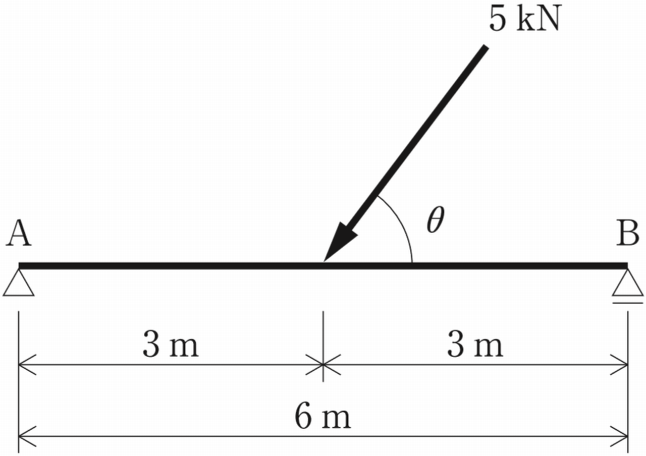 図に示す集中荷重を受ける単純梁の支点A及びBに生じる鉛直反力(VA,VB)及び水平反力(HA,HB)の値として,